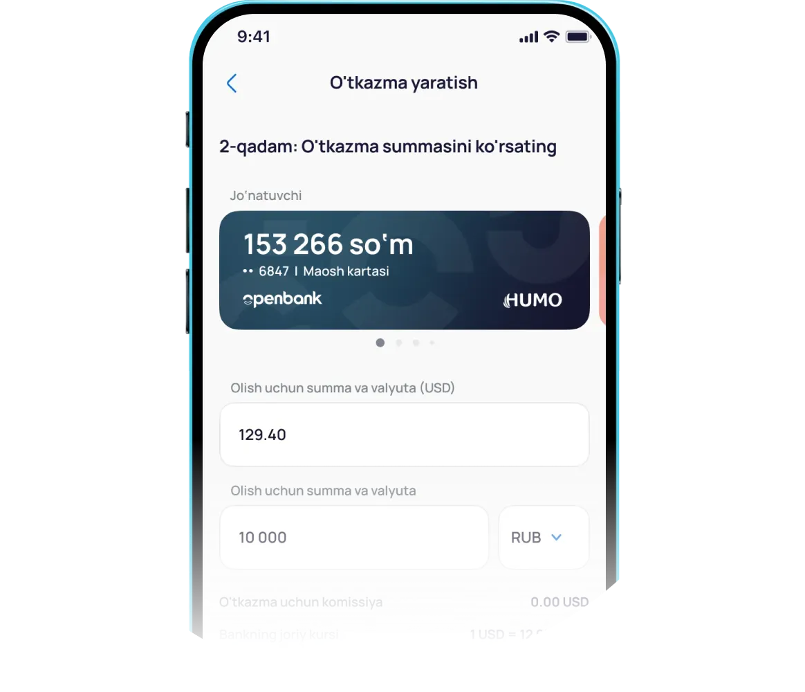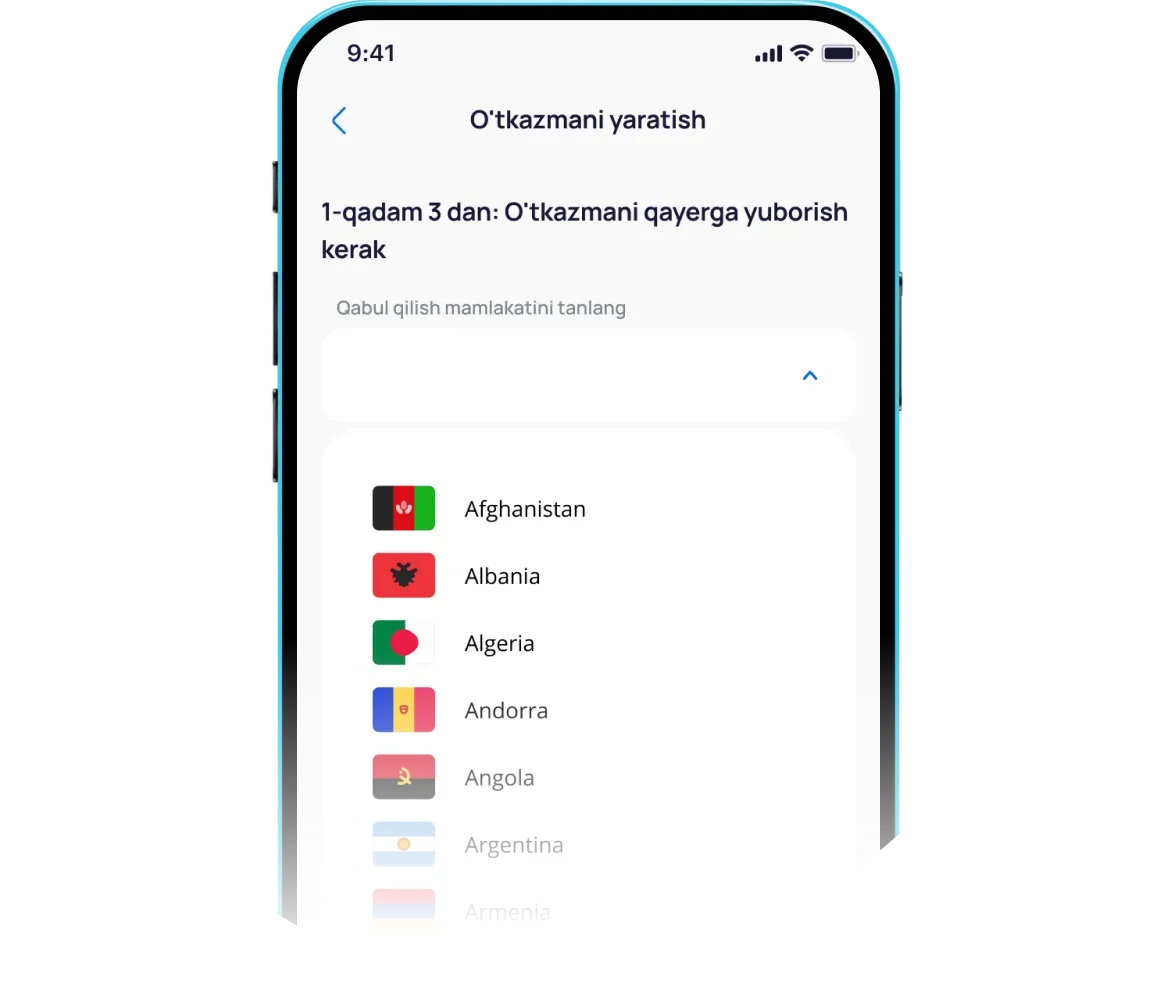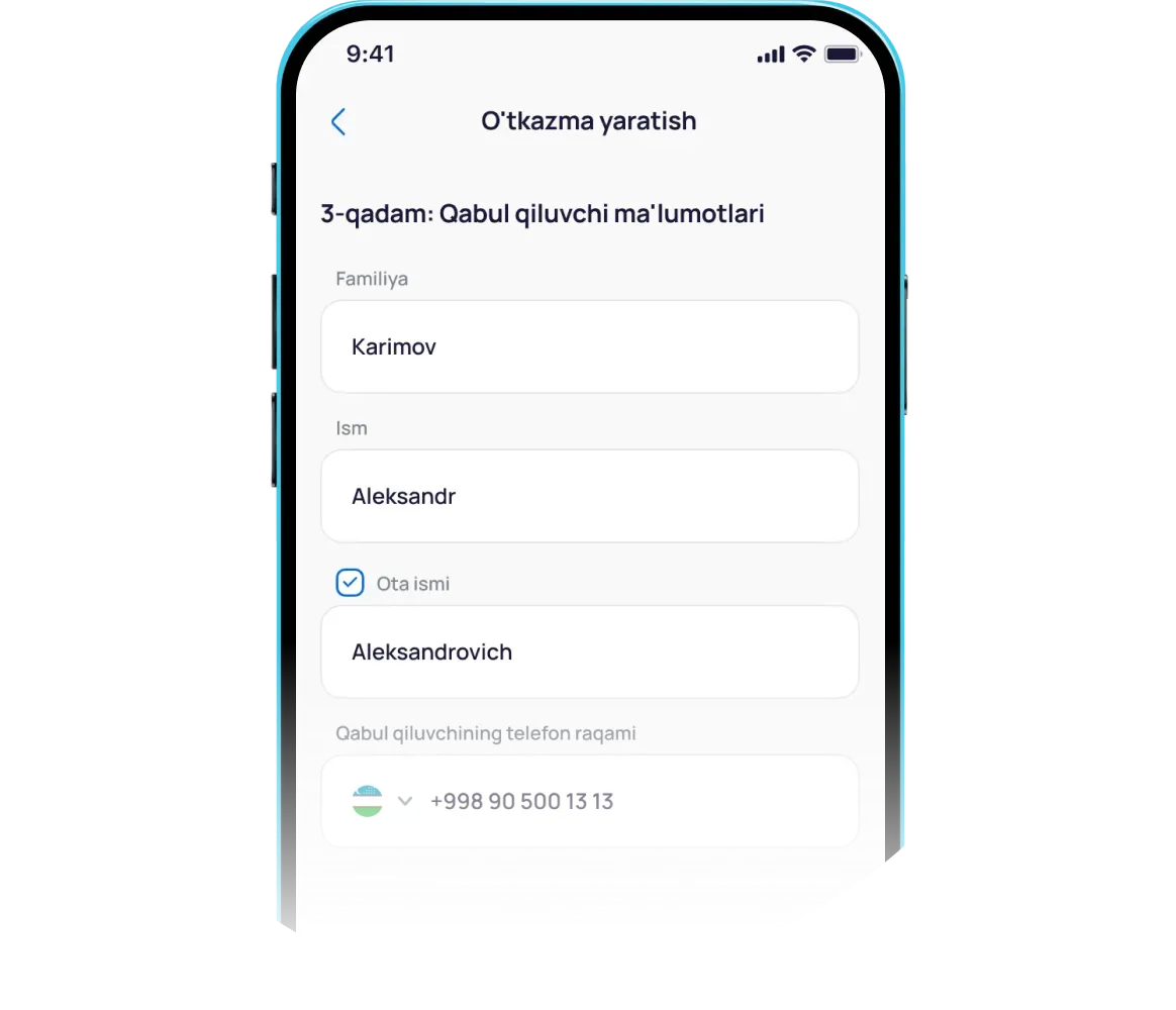 Bank hisob raqami ochmasdan ham yuborish mumkin — buning uchun faqat mobil telefon va jo‘natuvchi/qabul qiluvchining asosiy ma’lumotlari kifoya.